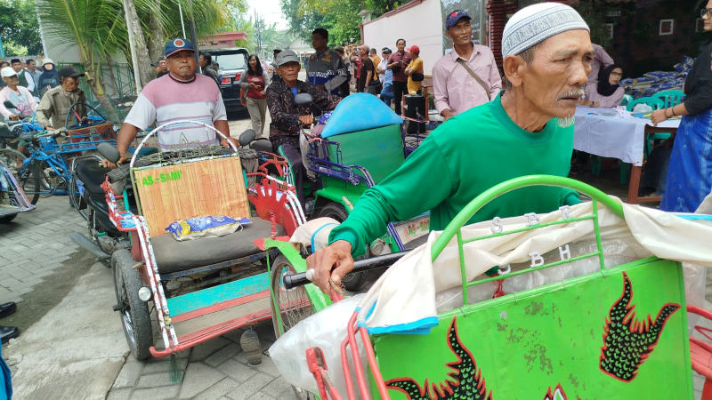 Katubi, yang menjadi orang pertama dalam antrean, akhirnya mendapat lima kilogram beras dan uang tunai. Senyumnya terkembang saat kembali mengayuh becaknya menuju rumah sederhana di Desa Tampingmojo, Kecamatan Tembelang.