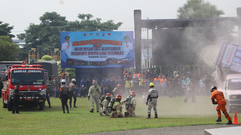 Acara ini dipimpin Bupati Jombang, Warsubi, dan dihadiri oleh Forkopimda, TNI, Polri, BPBD, relawan, dan organisasi mitra penanggulangan bencana.