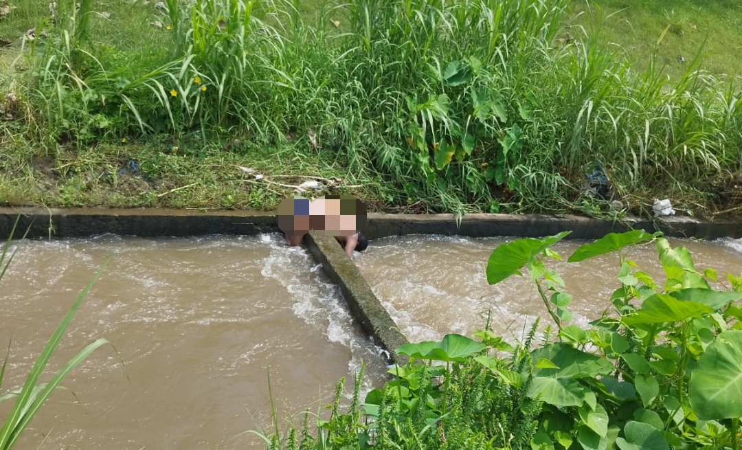 Mayat Mr X saat ditemukan telungkup di cor pembatas sungai Dusun Paras, Desa Turipinggir, Kecamatan Megaluh, Jombang